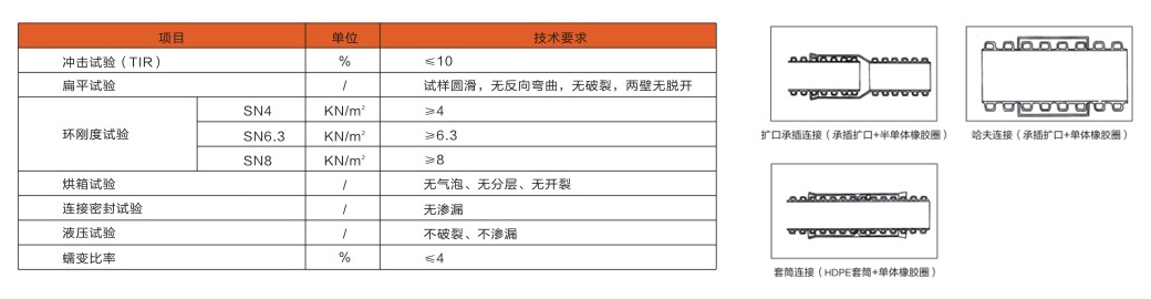 較較(HDPE)具有優(yōu)良的化學穩(wěn)定性,不易老化及耐環(huán)境應力開裂的性能。由其為原材料生產(chǎn)出來的HDPE雙波壁紋管屬于柔性管。其主要特征如下: